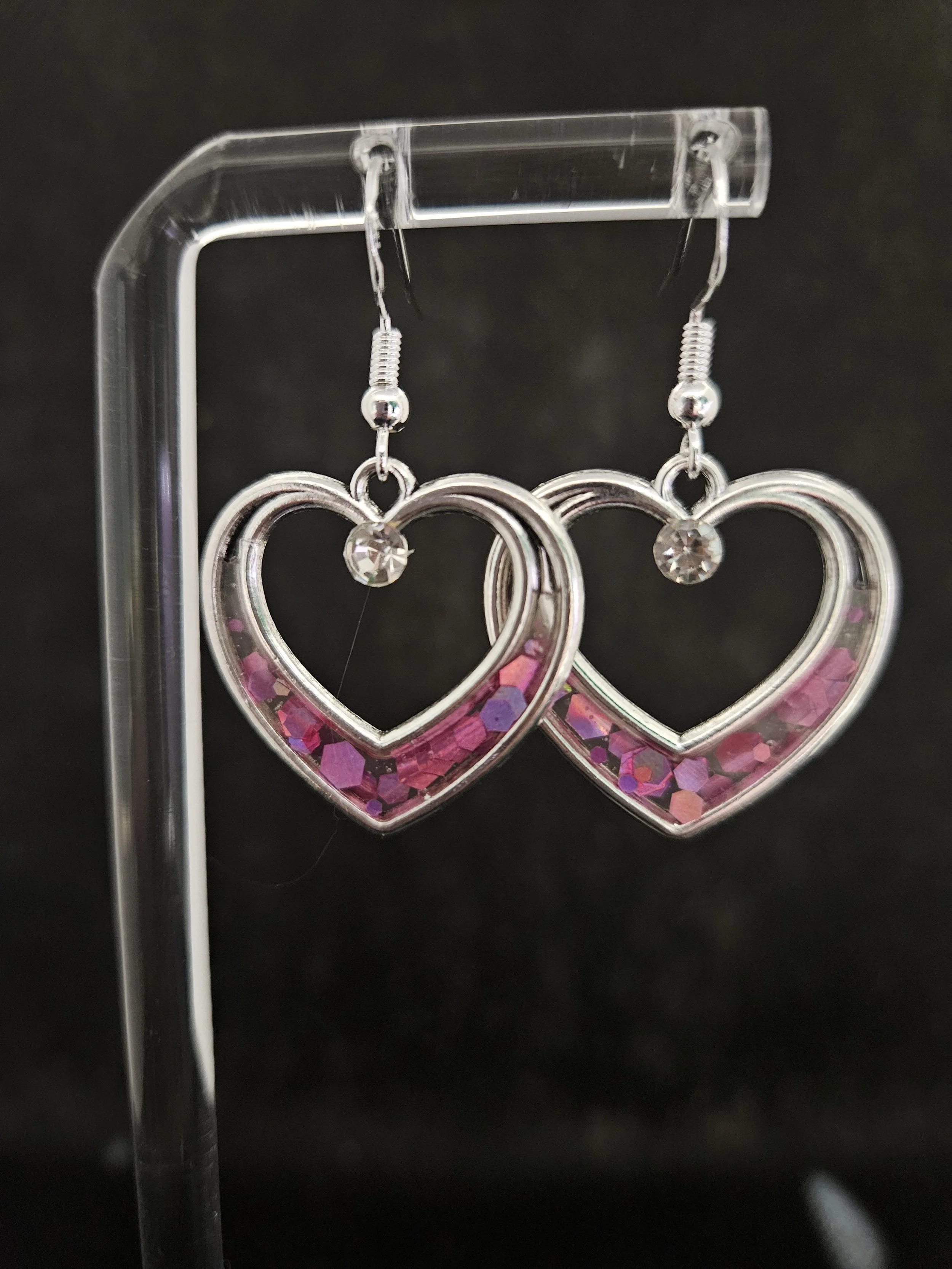 Fall in love with the shimmer of these handcrafted SparklingHeart Earrings, designed to catch the light with every movement. Each heart features a polished silver outline and a mosaic of pink and purple reflective pieces, creating a dreamy, romantic glow. Finished with a delicate crystal accent at the hook, these earrings feel both elegant and playful — perfect for date nights, anniversaries, or gifting someone special.