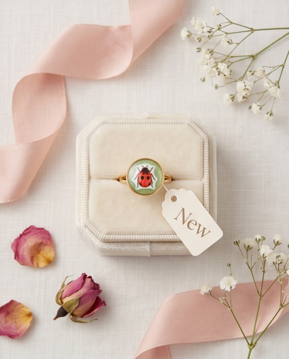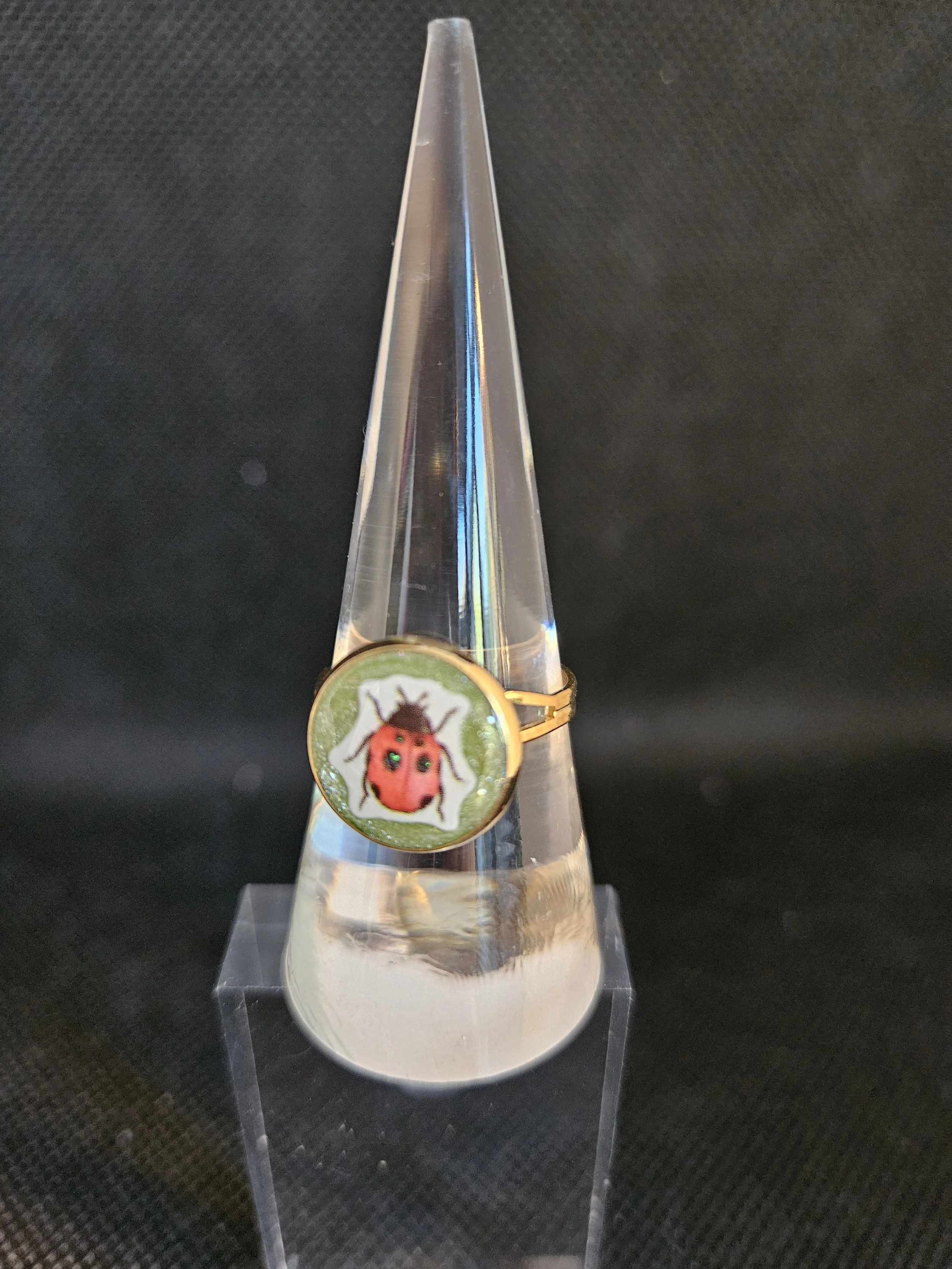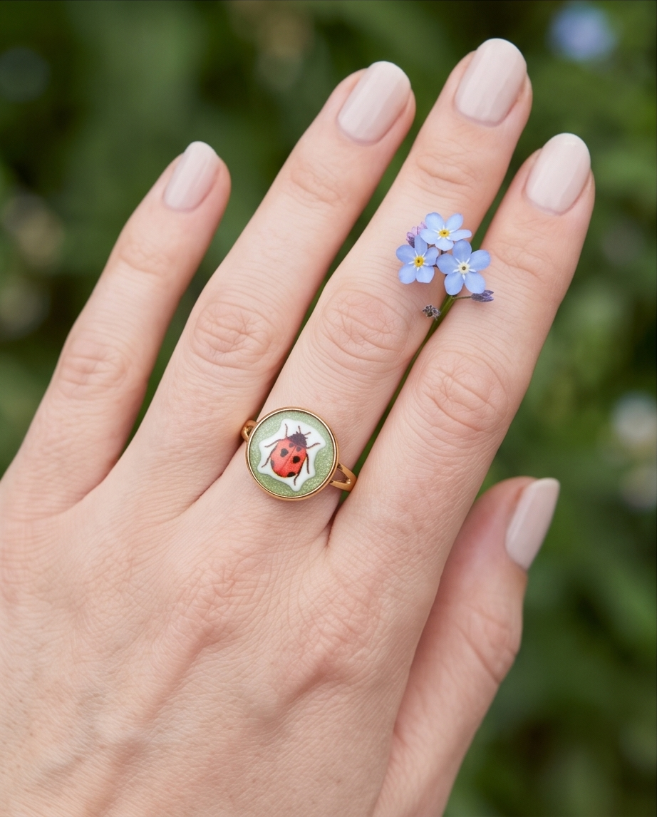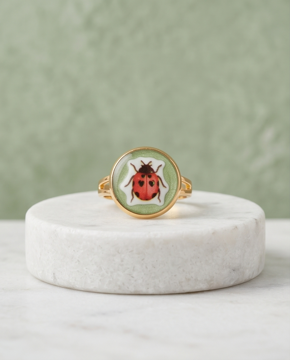 Bright, cheerful, and full of personality, this ladybird adjustable ring is the perfect accessory for anyone who loves cute, nature‑inspired jewellery. The circular face features a charming red ladybird illustration with bold black spots, set against a soft green background for a fresh, spring‑like feel. The glossy finish enhances the artwork, giving it a vibrant, polished look.