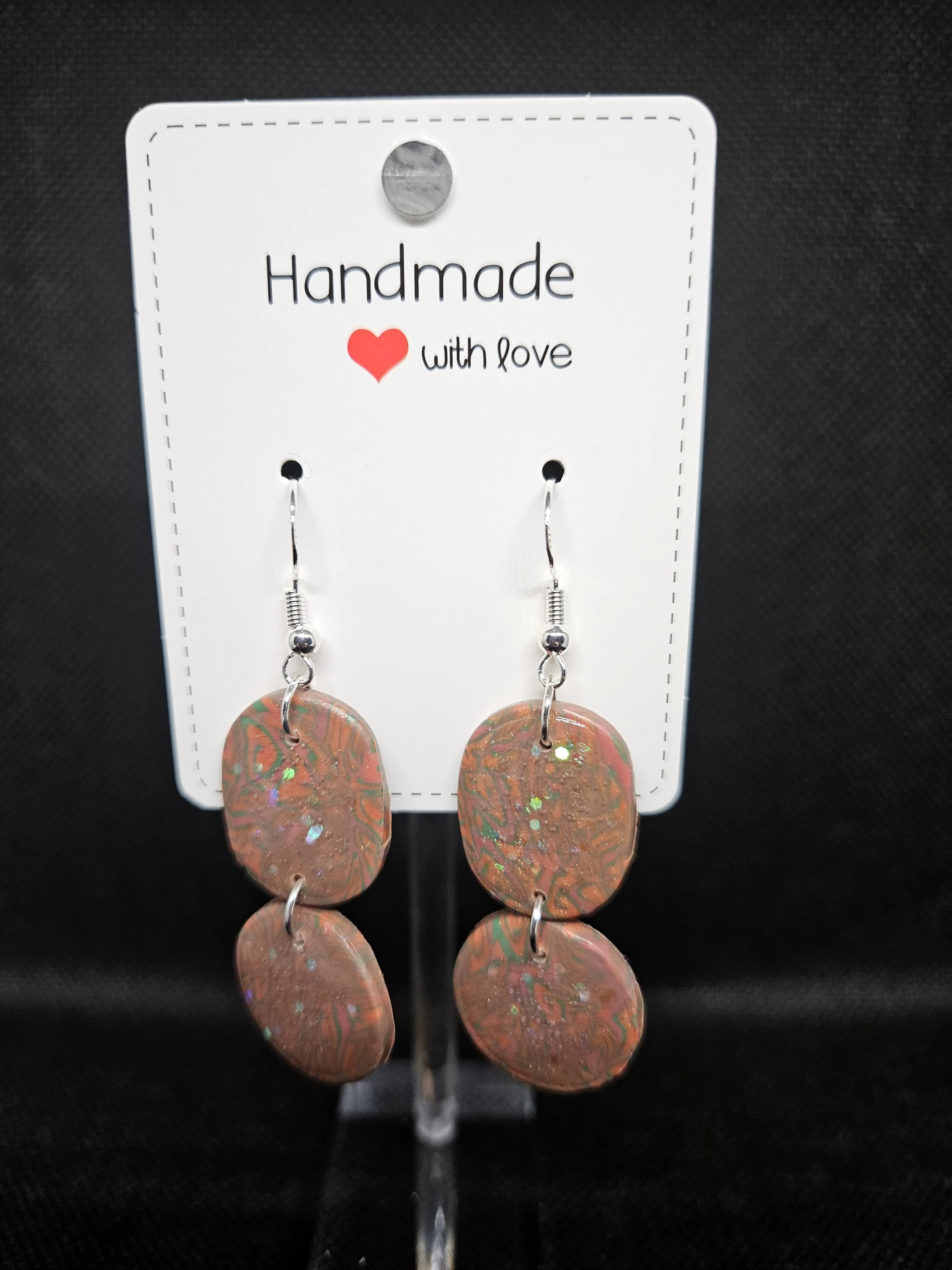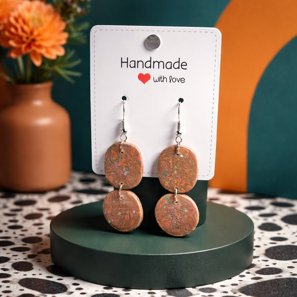 These handcrafted dangle earrings blend earthy elegance with a touch of iridescent shimmer. Each pair features two marbled clay ovals, layered in warm tones of burnt orange, deep brown, and soft green, creating a natural stone-like effect that feels both organic and artistic. Subtle sparkles catch the light as you move, adding a gentle glow without overpowering the design.