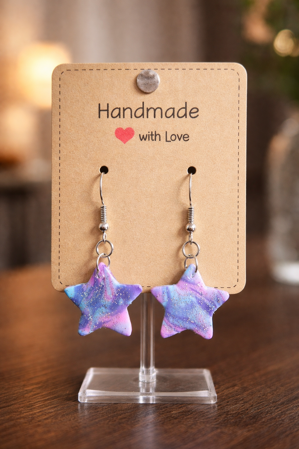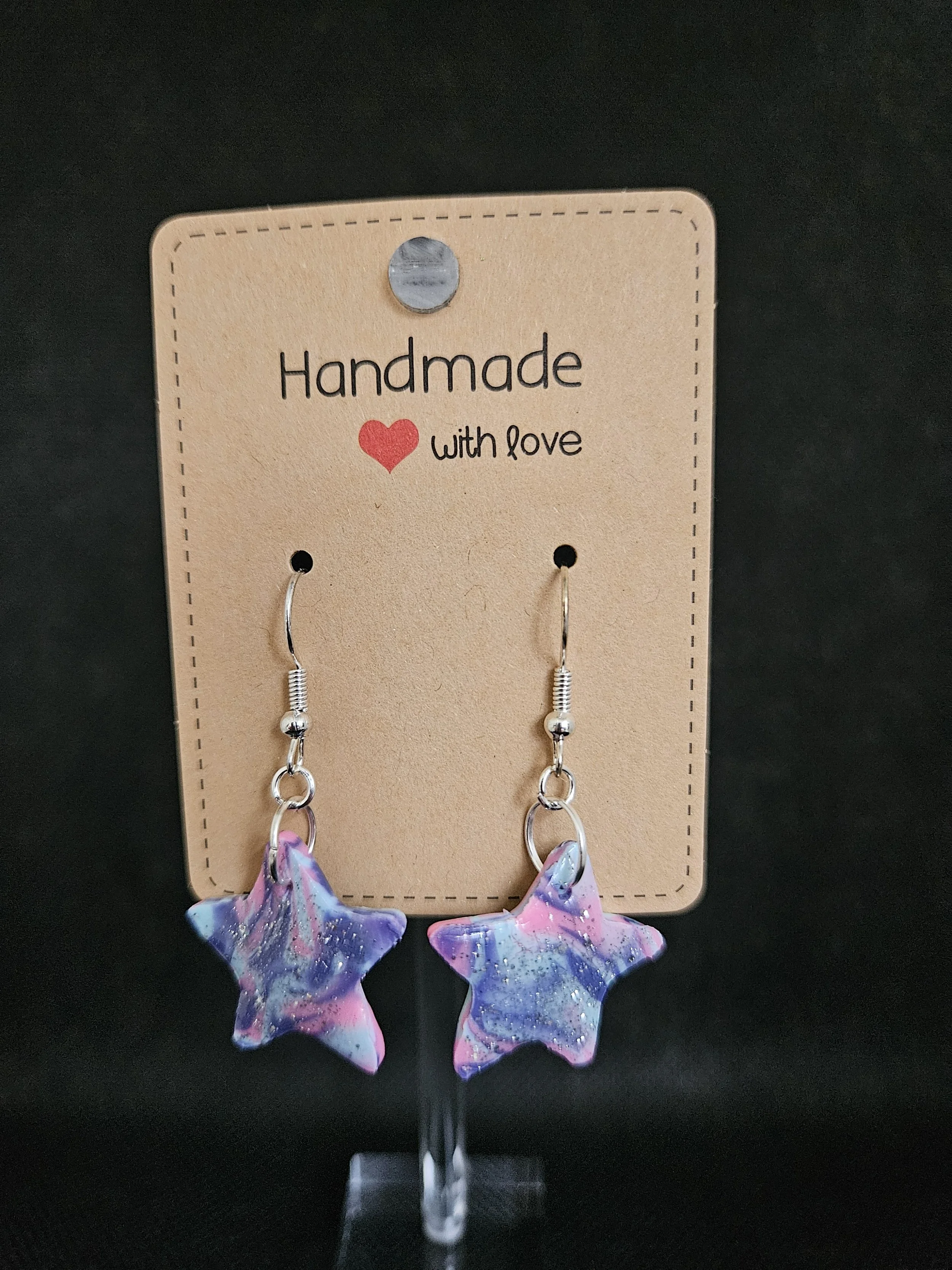 A pair of earrings designed to look like tiny galaxies you can wear. Each star is hand‑crafted with swirling purples, blues, and soft pinks, layered with shimmering glitter that catches the light like distant stardust. The resin finish gives them a smooth, glassy glow, while the star shape adds a playful, celestial touch.