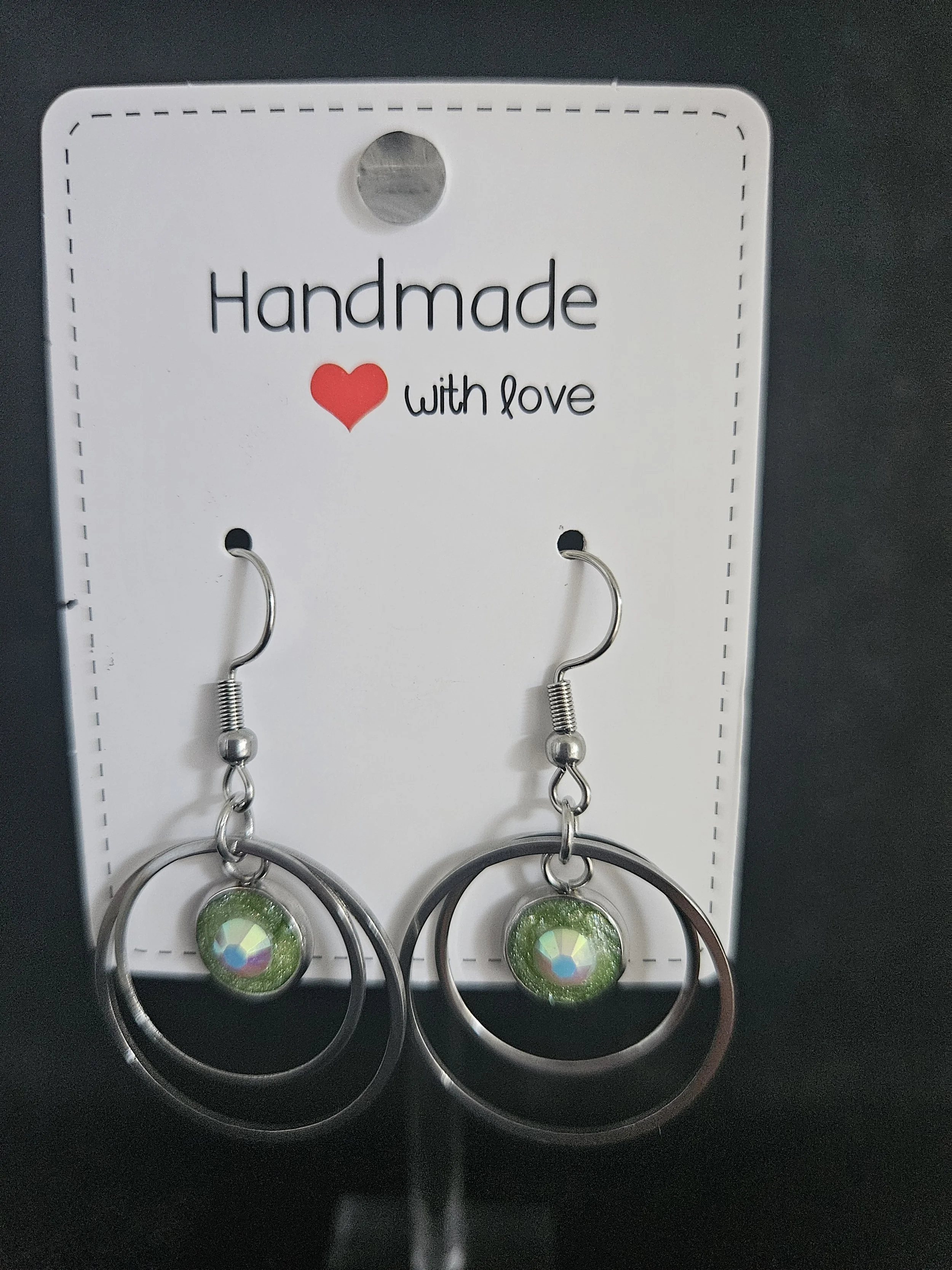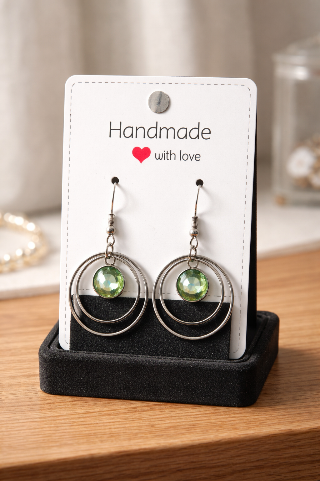 These handcrafted drops feature a shimmering green faceted bead suspended at the heart of three concentric metallic circles. The layered rings create a gentle orbit effect, catching the light with every movement and giving the earrings a sense of motion and depth. The green centre stone adds a bold, luminous pop of colour, making them perfect for anyone who loves jewellery that feels both modern and a little bit mystical.